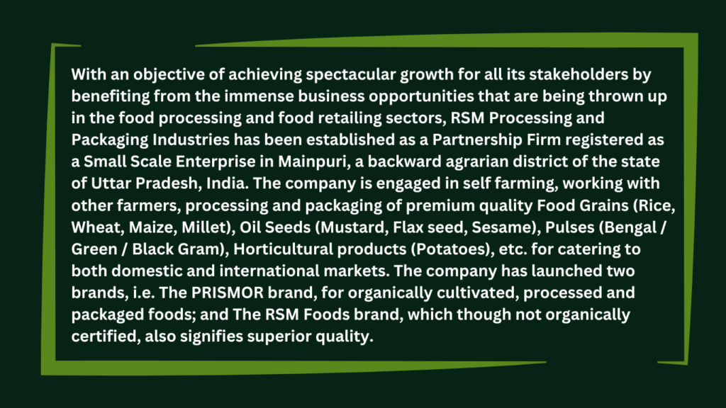 Raw material sourcing – All products marketed under the PRISMOR and RSM Foods brands are cultivated in own farms or sourced from other reputed sources. We work directly with the farmers of the region. We are into self-cultivation since generations.